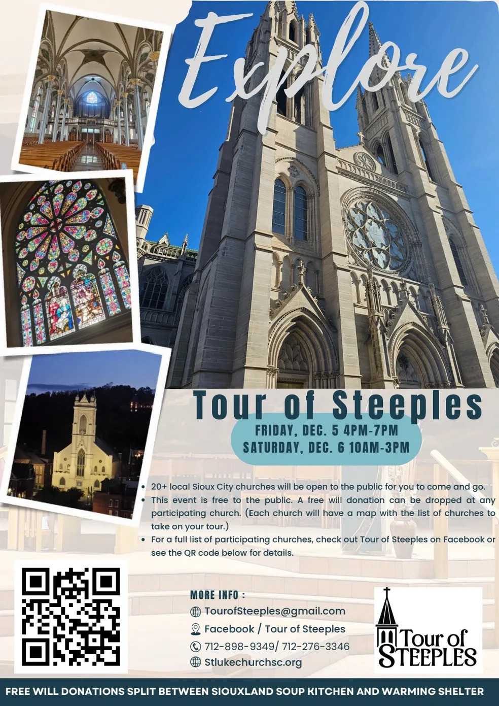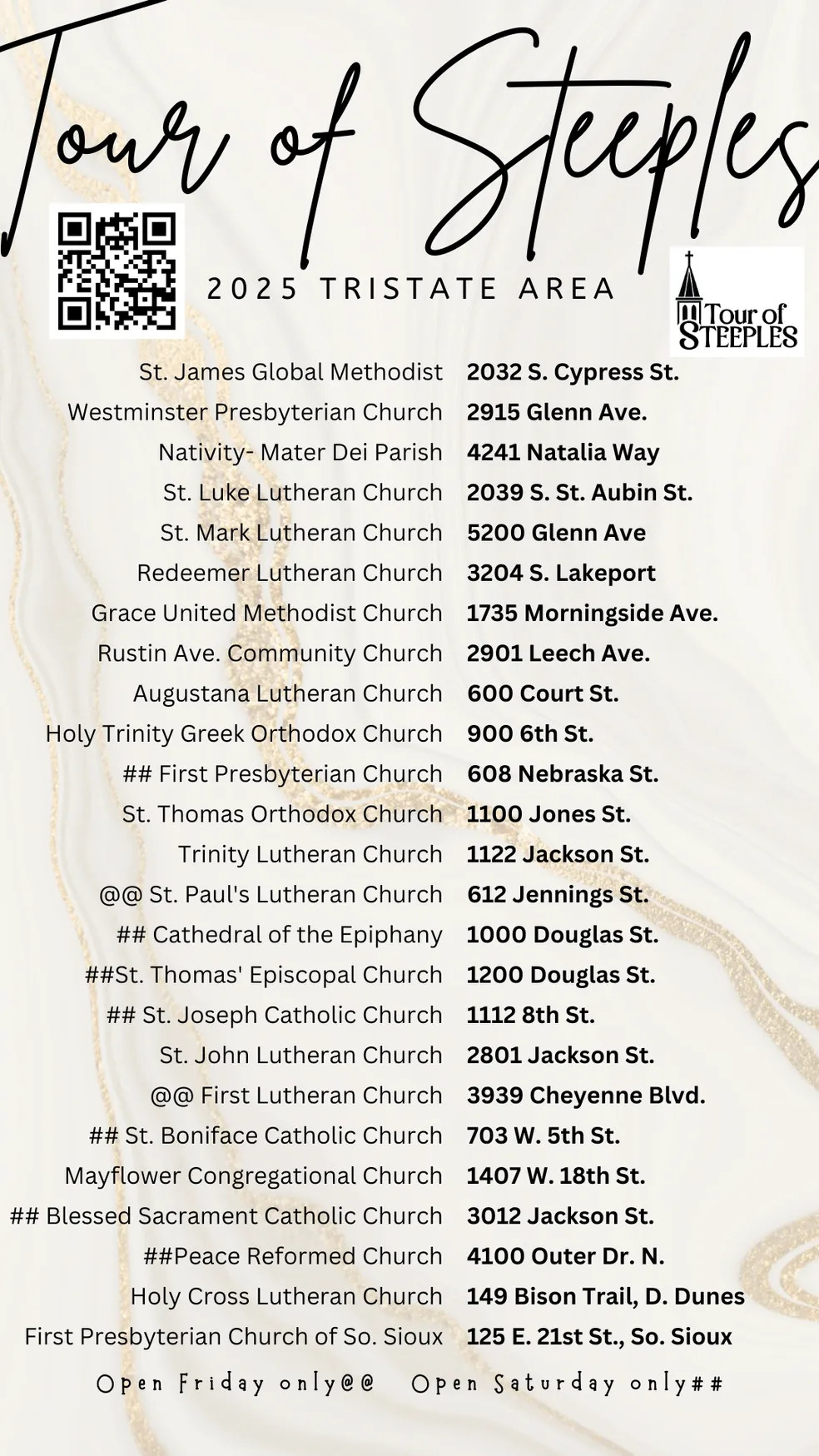 Join us for a fun afternoon where we will visit 25 local Siouxland churches and take a tour of the building between two days. Enjoy the history and architecture during these visits. Please see the image with the listings of which churches will be available each day.
